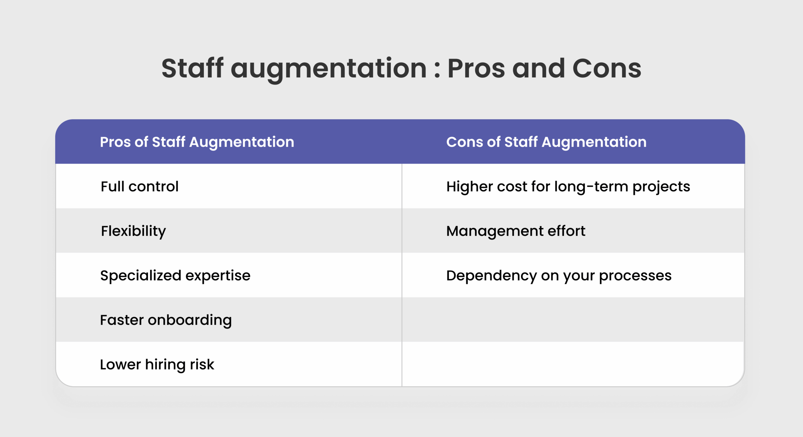 IT staff augmentation offers flexibility, but challenges include higher costs for long-term projects, management overhead, onboarding time, and reliance on your internal processes.